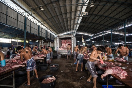 Next Image Butchering pig carcasses at an outdoor market. Thailand, 2019. Butchering pig carcasses at an outdoor market. Thailand, 2019. (Jo-Anne McArthur / We Animals for The Guardian)