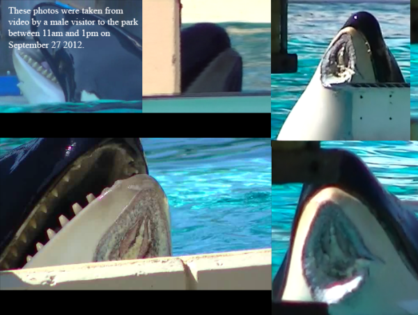 The rumour suggests that he may have been trying to get over the chains that SeaWorld has erected and has ripped the tissue down to the bone – it appears from the thumbnail that the lower edge of both mandibles has been stripped back to the bone. It seems that a chunk of tissue the size of a dinner plate is gone – from a side profile it looks like the orca has a bottlenose dolphin profile on the lower jaw.”